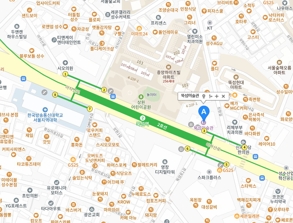 뚝섬미술관은 지하철 2호선 뚝섬역 3번 출구를 나와 바로 옆에 위치해 있어, 비오는 날이나 더운 여름에도 부담 없이 방문할 수 있습니다. 도보 1분 거리의 뛰어난 접근성이 큰 장점입니다.