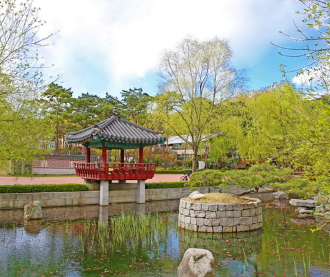 원당샘 연못, 정자 사모정 등 쉼이 가능한 구조물이 있고, 꽃담과 벽천처럼 조경 요소가 많은 점이 특징입니다. 연못 옆 잔디밭에서는 산책이나 가벼운 여가활동을 즐기는 주민들도 많습니다. - 주변 문화 및 역사 자원