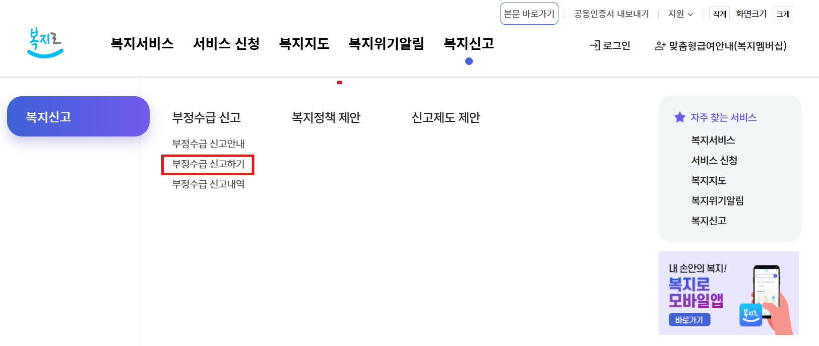 복지로 메인 페이지 > “부정수급 신고센터” 메뉴에서 바로 신고할 수 있습니다.