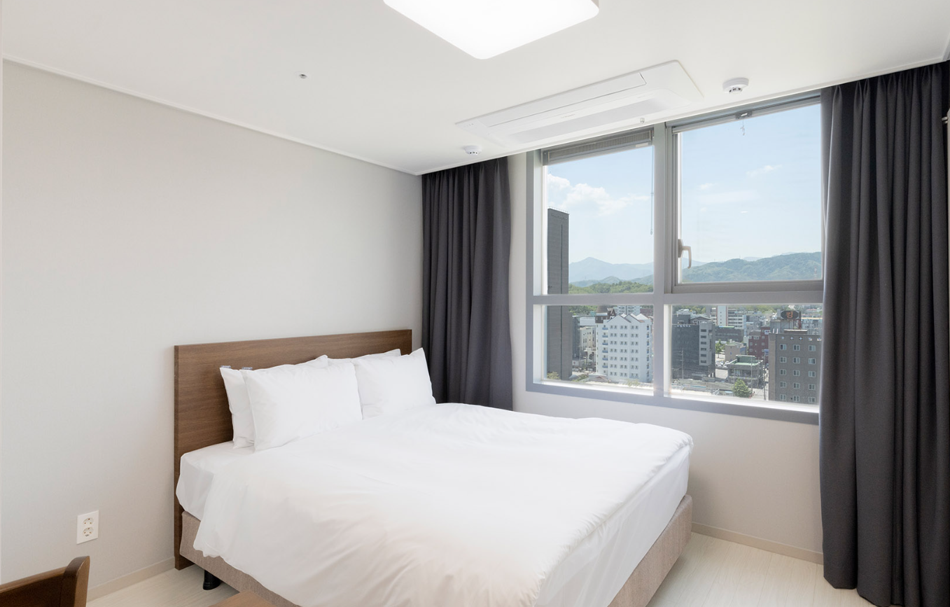 - 신축 호텔이라 객실 내부가 깨끗하고 현대적이며, 전망 좋은 통창이 인상적입니다.